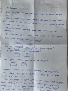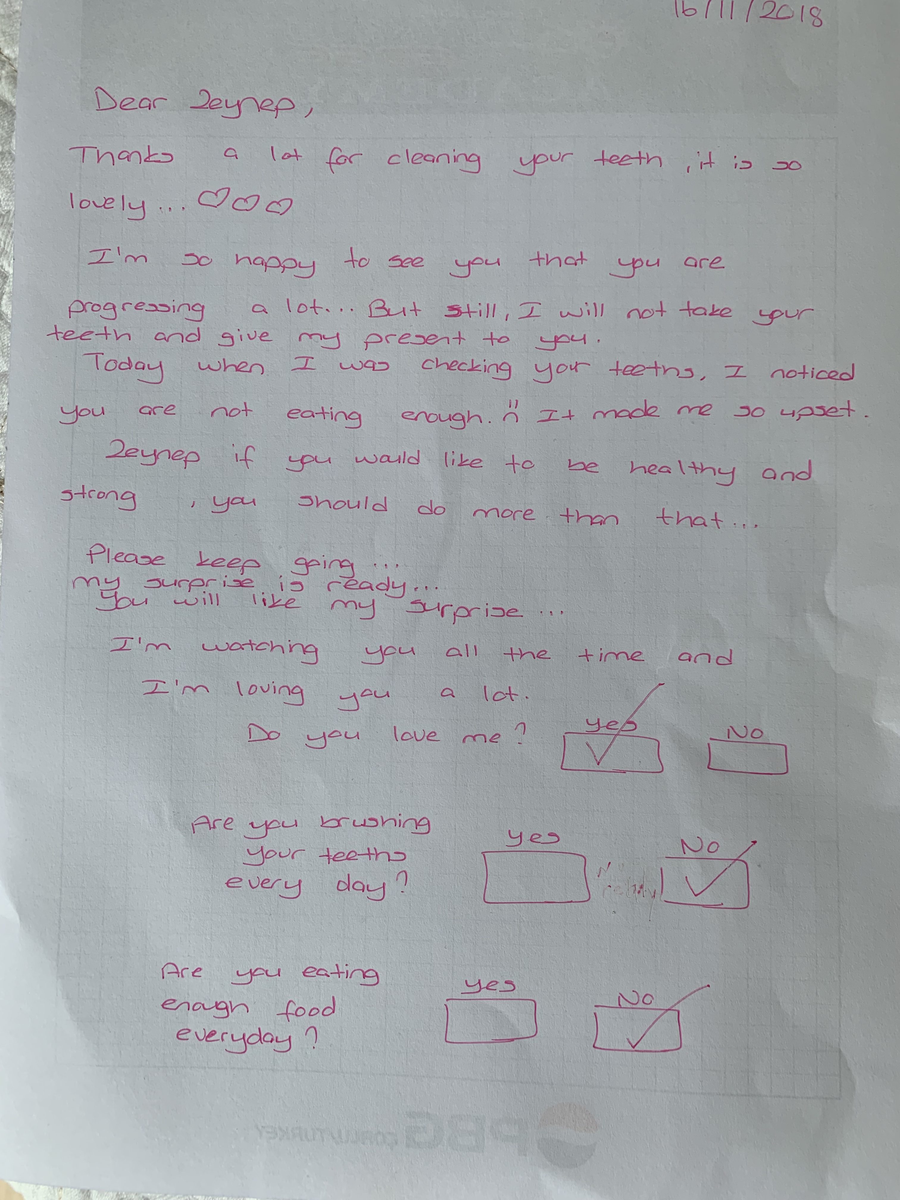 Peri: Zeynep, dişini temizlediğin için çok teşekkür ederim, çok tatlısın… İlerdiğini gördüğüme çok seviniyorum… Ama dişini yine de almayacağım ve sana hediyeni vermeyeceğim. Bugün dişlerini kontrol ederken yeterince yemediğini fark ettim 🙁 bu beni çok üzdü. Zeynep eğer sağlıklı ve güçlü olmak istiyorsan, bundan daha fazlasını yapmalısın… Lütfen devam et….Süprizim hazır… Süprizimi seveceksin… Ben seni her zaman izliyorum ve seni çok seviyorum…