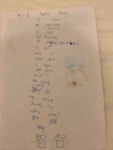 Mektubu sabah okuyan Zeynep şoka girdi… Dişim pis olduğu için almamış dedi… Hemen gittik ve fırçaladık, kanlı çıkmış dişi temizledik… Ben ısrarla Zeynep diş perisin çıkmış dişini söylemiyor, diğer dişlerin için söylüyor ve ayrıca iyi yemediğin için sağlıklı değilmişsin diyor dedim. Sen diş perisini tanımıyorsun anne, bak dişim pis olduğu almamış dedi 🙁